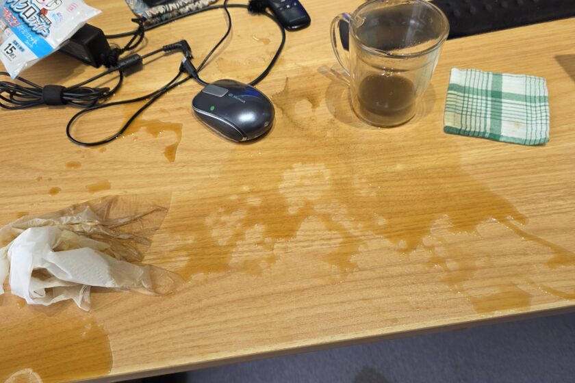 とっさにデスクにあったティッシュに手が伸びて、対処を試みますが、ティッシュというのは鼻水には対処できても、床に垂れ落ちる大量の茶色い液体を食い止める能力は持ち合わせていないことを確認して終わってしまいました。かくして、テーブルにぶちまけられた液体の多くが床の椅子マットの染みになる運命となったのであります。