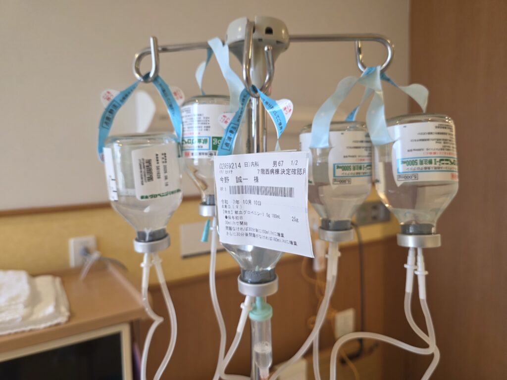 《人生初体験の景色:迫力の点滴5ボトル連結》
