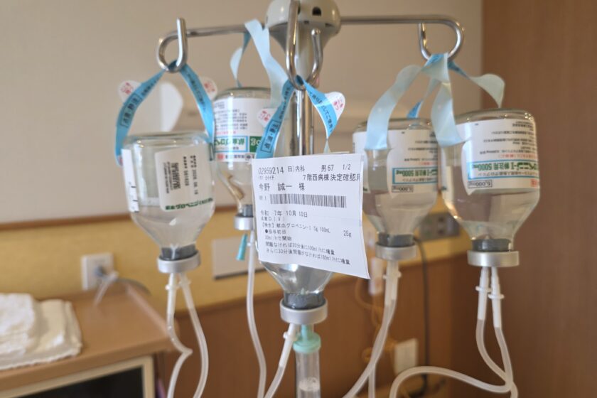 《人生初体験の景色:迫力の点滴5ボトル連結》