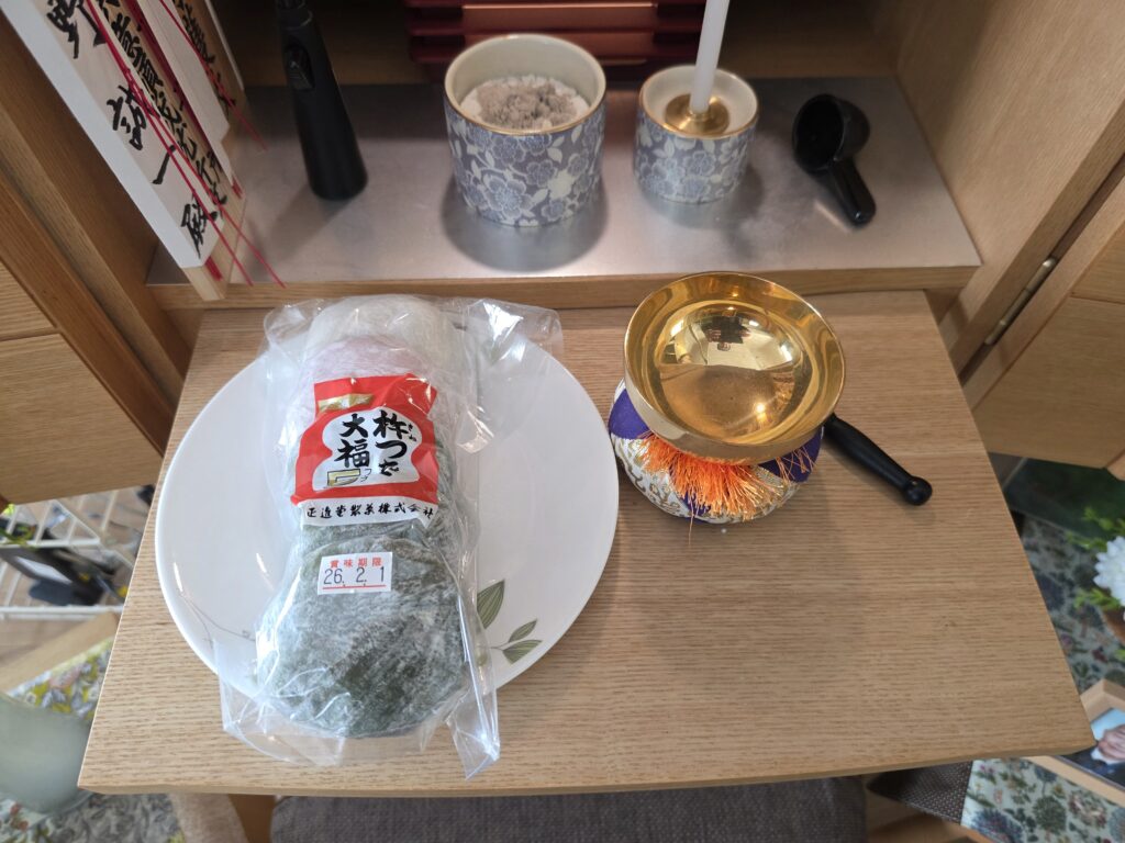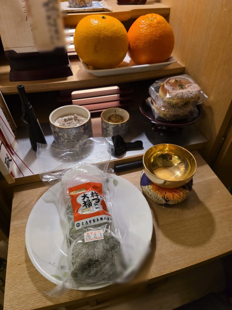 そして、毎日の供物を欠かしません。必ず備えているのが、思い出の象徴である「杵つき大福」です。