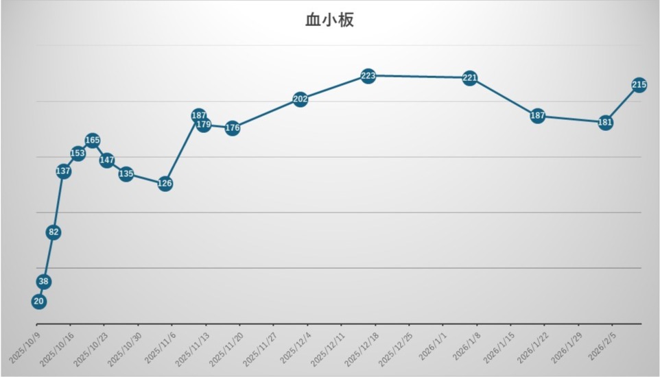 直近の血液検査は、2月10日でした。血小板の値は「21万5千/$\mu$L」と、入院以来の推移からすると高いところに安定した数値です(/$\mu$Lという単位については、説明を省きます)。